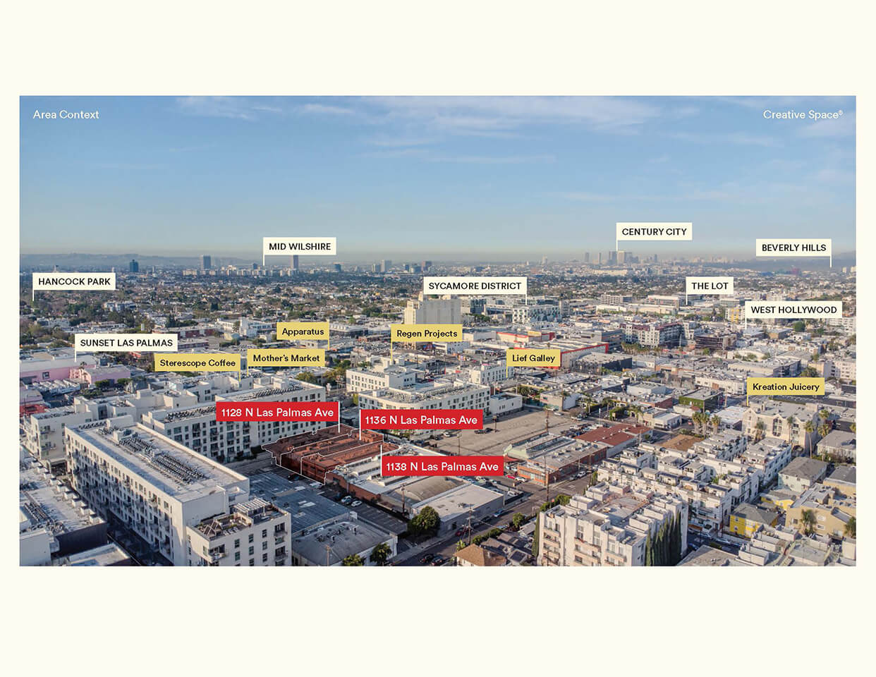 The buildings sit within a vibrant ecosystem of art galleries, fashion showrooms, design studios, and destination dining concepts, surrounded by institutions such as Regen Projects, Blackman Cruz, BDDW, lief, Jeffrey Deitch, and Sunset Las Palmas Studios.
